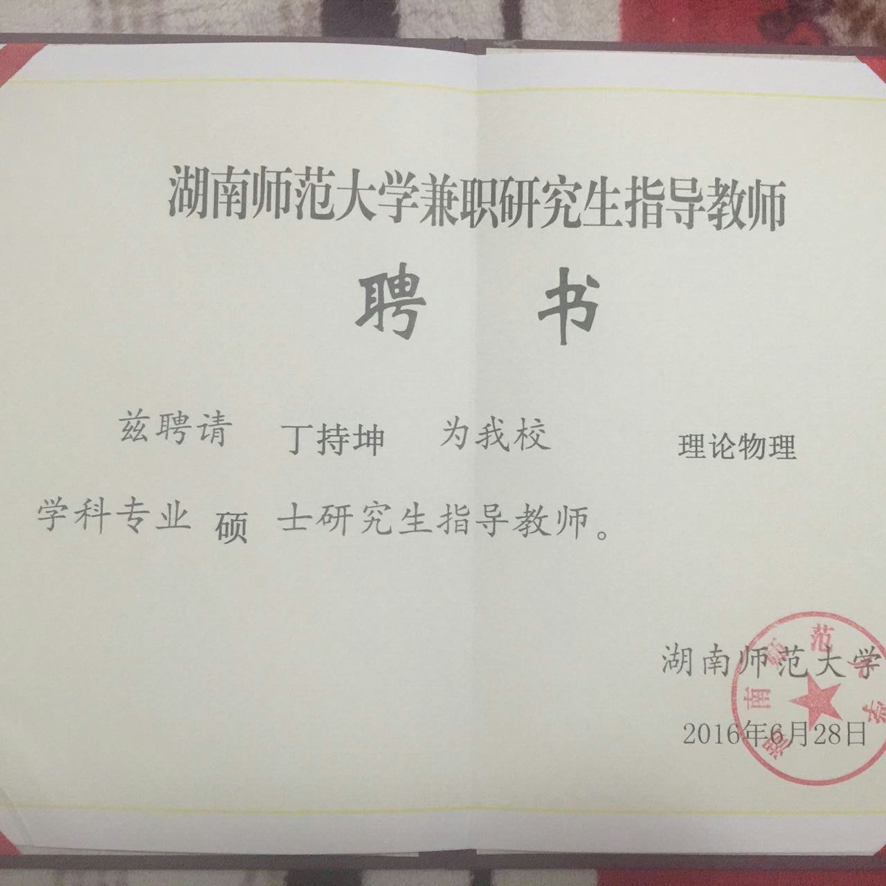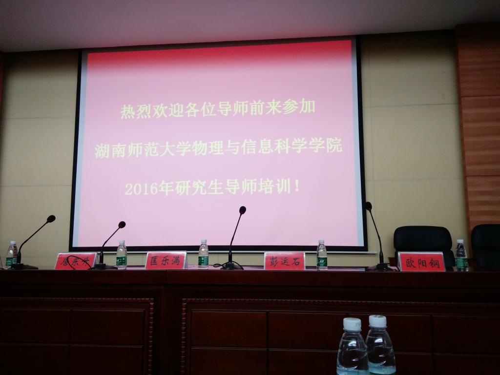 2016年11月19到20日,我所成员丁持坤博士参加湖南师范大学2016年新增导师培训会议。参加培训的为湖南师大本校的和校外的新增研究生导师,会议由物理与信息科学学院党总支书记康洪主持。这是继2015年起担任贵州大学研究生导师之后,今年起丁持坤又开始担任湖南师范大学的研究生导师,招生学科学位为理论物理学科、硕士科学学位。