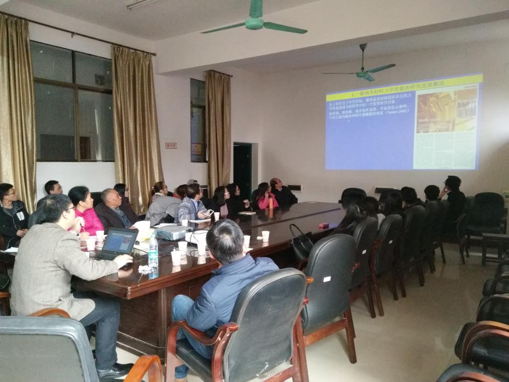 王教授报告了他自己近几年的科研成就:一维纳米材料(纳米线、纳米带和纳米管)的力学表征方法、力学性能特征、利用单根一维纳米材料来测量纳米尺度下的表面作用力。王教授还介绍了他自己的科研经验:专心于自己的实验研究,保持对新事物的好奇心,构建物理模型,如构建了纳米线摩擦力大小的模型。他鼓励广大同学报考物理学的研究生,为基础学科的发展做出贡献。物理专业和化学专业的老师和同学聆听了报告并热情互动。