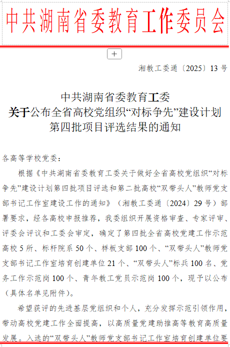 4月12日,中共湖南省委教育工作委员会下发《关于公布全省高校党组织“对标争先”建设计划第四批项目评选结果的通知》,外国语学院教工第一党支部获评第四批全省高校党建“样板支部”,实现了我院党建“示范创建”工作的新突破。