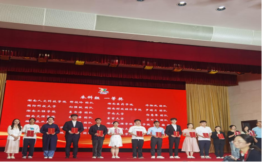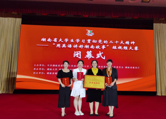 9月15日上午,由中共湖南省委外事办、中共湖南省委教育工委、湖南省教育厅主办,湖南大学、高等教育出版社承办的湖南省大学生学习贯彻党的二十大精神——“用英语讲好湖南故事”短视频大赛闭幕式暨颁奖典礼,在长沙湖南宾馆隆重举行。由beat365外国语学院选送的邹枝吟团队(成员包括邹枝吟、杨凯威、刘宇舟和蒋旭文)作品《看不见的鼓者》荣获本科组一等奖第一名的好成绩,并且将于9月23日代表湖南省出征在南京大学苏州校区举行的国赛;外国语学院刘欣磊、邓梦林老师获“优秀指导教师”奖,beat365正版唯一官网必一获“优秀组织奖”。