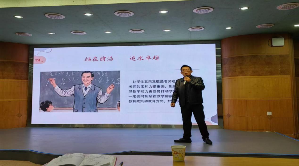 主讲老师是来自娄底市第四中学的谢振国老师,他以丰富的教学经验和独特的教育理念为在座的学生们带来了深刻的启发。谢老师围绕“师德师范”“终身学习”“教育情怀”和“站在前沿,追求卓越”四个主题,深入探讨了如何成为一名“学生喜欢、学生想要成为的”人民教师。他指出,教师不仅是知识的传播者,更是学生成长道路上的引导者和支持者。谢老师强调,作为一名教师,应该“严格要求自己与学生,同时在严格中体现关爱。”这句话深深打动了在场的每一位学生,让大家意识到教师的责任不仅在于教授知识,更在于关心学生的成长与发展。