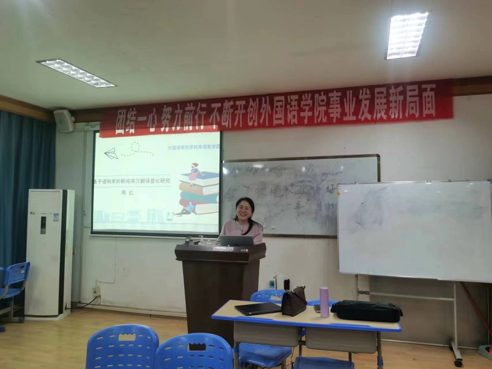 2023年11月28日下午,外国语学院周红老师在播馨楼301举行了“基于语料库的新闻英汉翻译显化研究”学术讲座。讲座由学科英语教学方向带头人禹逸群主任主持,学科英语教学团队全体教师和外国语学院另外两个教学团队部分教师参加了此次讲座。