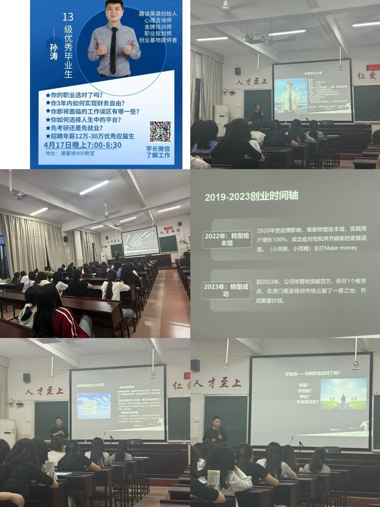 2025年4月17日晚上,外国语学院在播馨楼406成功举办“给我一小时,解决你的就业迷茫”校友职业发展经验分享会。本次活动特邀学院2013级英语教育专业优秀校友、趣读双语绘本馆创始人孙涛担任主讲嘉宾,吸引了近100名在校学生参加。