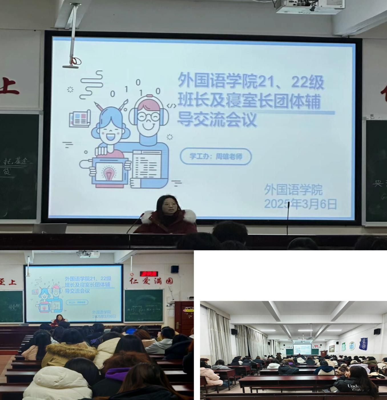 为进一步提升寝室管理水平,加强信息联络机制,外国语学校学工办周雄于3月6日在播馨楼406召开了21、22级信息联络员团体辅导交流会议。