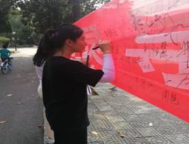 活动开展前期,心理部组织各班同学绘制完成了心理漫画及心理板报的制作,并于当天陈列在播馨楼大厅及前坪中。活动开展时,心理部成员组织了全体同学进行“与阳光作伴,为心灵导航”横幅签名活动,同时让同学们了解了“5.25"的由来以及普及了相关的心理知识,让同学们认识到心理健康的重要性,学会关爱自己,关爱他人。当天活动开展顺利,同学们积极参与,申忠明书记和刘莉副书记以及辅导员老师也热情参与了横幅签名活动。