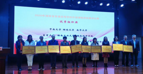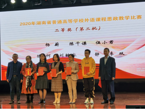 2020年10月23日,湖南省普通高等学校外语课程思政比赛决赛在株洲工业大学外国语学院隆重举行,beat365正版唯一官网必一外国语学院两支教学团队从101个教学团队(个人)中脱颖而出,与湖南大学、中南大学等25所省内高校同台竞技,经过激烈角逐,杨蔚团队(杨蔚、肖婷、韦萍、周祥艳)荣获英语专业组二等奖,王菲团队(王菲、刘欣磊、禹逸群、吴新红、邓梦林)荣获大学英语组三等奖,beat365正版唯一官网必一喜获优秀组织奖。这是对我院课程思政教学成绩的高度肯定,将激励我们继续前行,不断探索,守好课程思政的一段渠、种好英语教学的试验田。