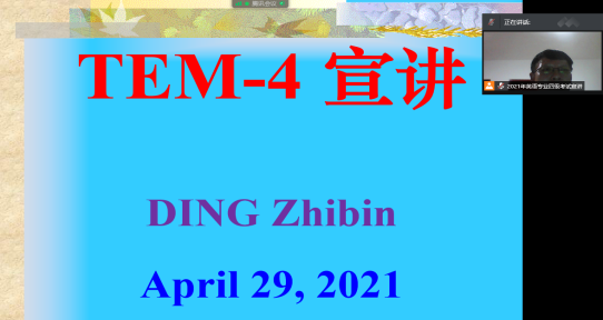 4月29日晚,我院学术分委员会主任丁志斌教授(博士)通过腾讯会议开设了2021年TEM4考前宣讲报告会,外国语学院2017级(部分)、2018级(部分)和2019级300余名学生聆听了此次在线宣讲。报告会由英语教研室主任禹逸群老师主持。