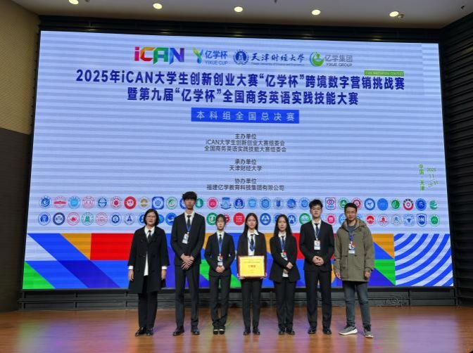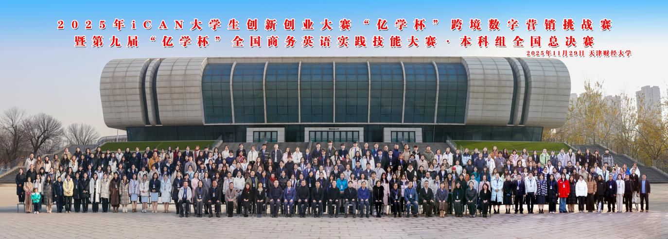 11月29日,2025年iCAN大学生创新创业大赛“亿学杯”跨境数字营销挑战赛暨第九届“亿学杯”全国商务英语实践技能大赛本科组全国总决赛在天津财经大学圆满落幕。iCAN大学生创新创业大赛是教育部官方认可的84项A类大学生学科竞赛之一,也是国内最具影响力的青年创新创业赛事之一。本届赛事汇聚了来自全国28个省份的300多所高校,共计1000余支队伍激烈角逐,最终仅有60支队伍脱颖而出,成功晋级全国总决赛。