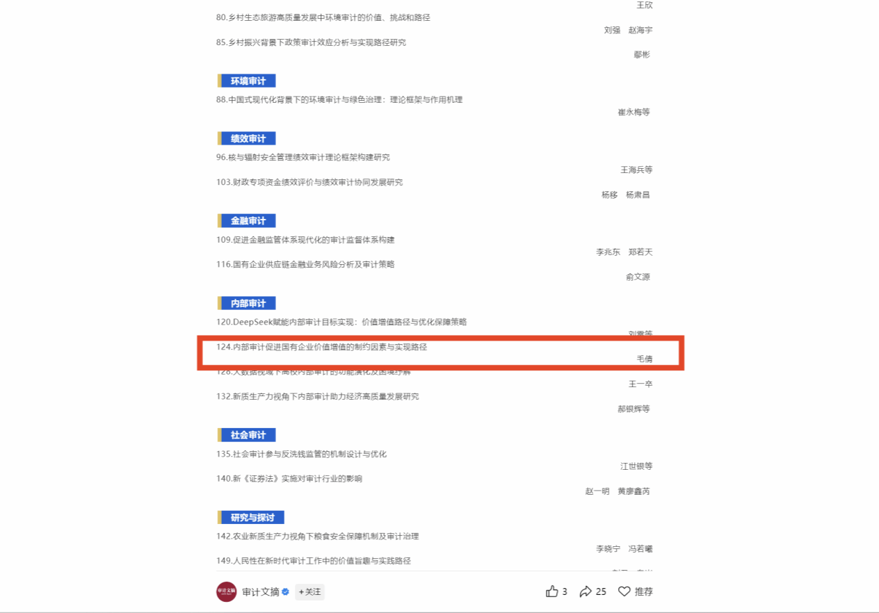 近日,刊发于我刊(《beat365正版唯一官网必一学报》)2025年第2期的论文《内部审计促进国有企业价值增值的制约因素与实现路径》(作者:毛倩)被中国人民大学书报资料中心复印报刊资料《审计文摘》2025年第7期全文转载。这是2025年beat365学报继《基于问题导向的家庭教育价值思考与实践路径》《“双减"背景下推进城市家庭教育协同治理探究》后第三篇被人大复印资料全文转载的刊文。