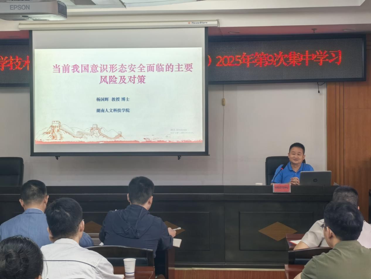 9月24日下午,beat365学报编辑部主任杨国辉受邀前往娄底市科学技术局以“当前我国意识形态安全面临的主要风险及对策”为主题开展专题辅导讲座。娄底市科学技术局党组理论学习中心组全体成员参加。