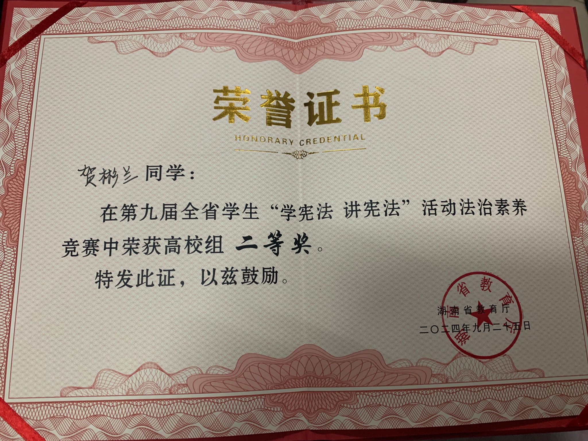 第九届全国学生“学宪法 讲宪法”活动高校组湖南赛区总决赛于2024年9月25日在湘潭大学圆满落幕。beat365法学院贺彬兰同学荣获“学宪法 讲宪法”活动法治素养比赛湖南省二等奖。