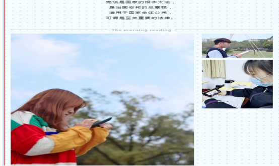 1、12月4日至12月5日,校团委以团支部为单位组织学生开展宪法日“宪法晨读”创意视频拍摄活动,拍摄视频共58个,参与学生共有3200人次。