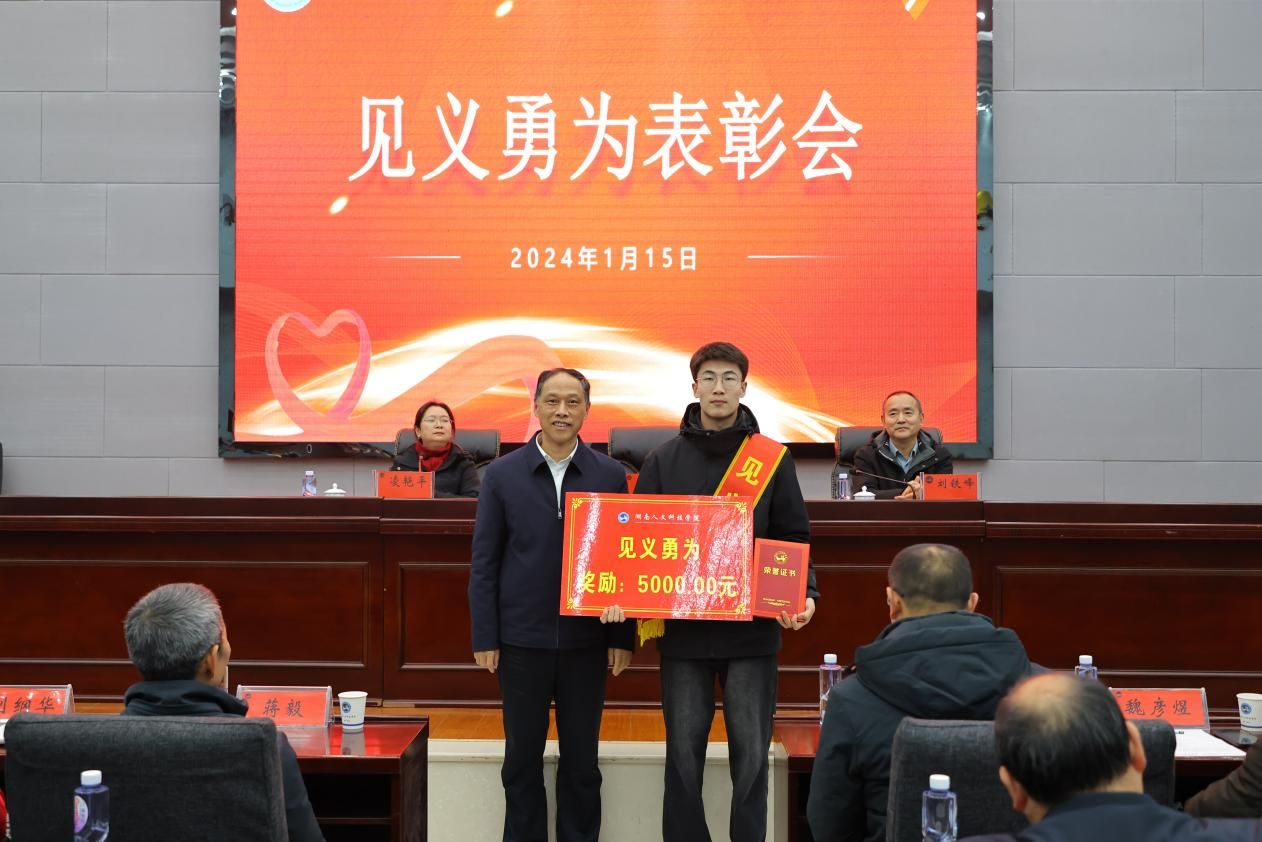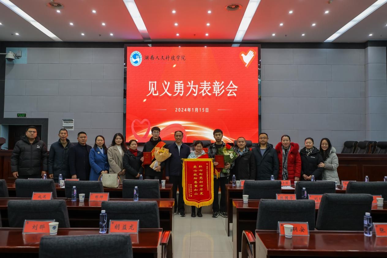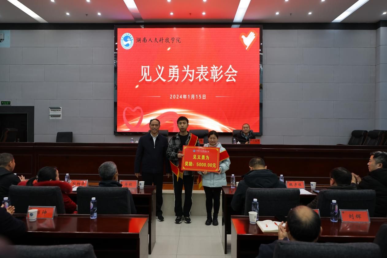 1月15日下午,学校在图书馆会议室举行见义勇为表彰会,隆重表彰嘉奖冬日勇救落水老人的周健同学和合力施救摩托车手的音乐舞蹈学院学生第一、二、三党支部。党委书记刘铁铭、党委委员、副校长刘铁峰、党委委员、纪委书记凌艳平、娄星区委政法委综治室副主任姚斌出席表彰会,相关职能部门主要负责人、各学院党总支书记、副书记、辅导员代表、团学干部代表参加会议。凌艳平主持会议。