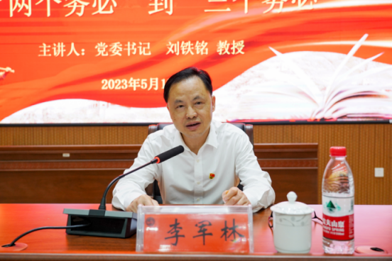 5月15日下午,党委书记刘铁铭在匠成楼为学校学习贯彻习近平新时代中国特色社会主义思想主题教育读书班作专题辅导报告。省委巡回指导组第二十九组组长,省乡村振兴局党组原书记、原局长,省人大常委会委员、农业委副主任委员王志群及巡回指导组成员傅乐平、胡宇,全体在家校领导出席,全校副处级以上干部参加。党委副书记李军林主持报告会。