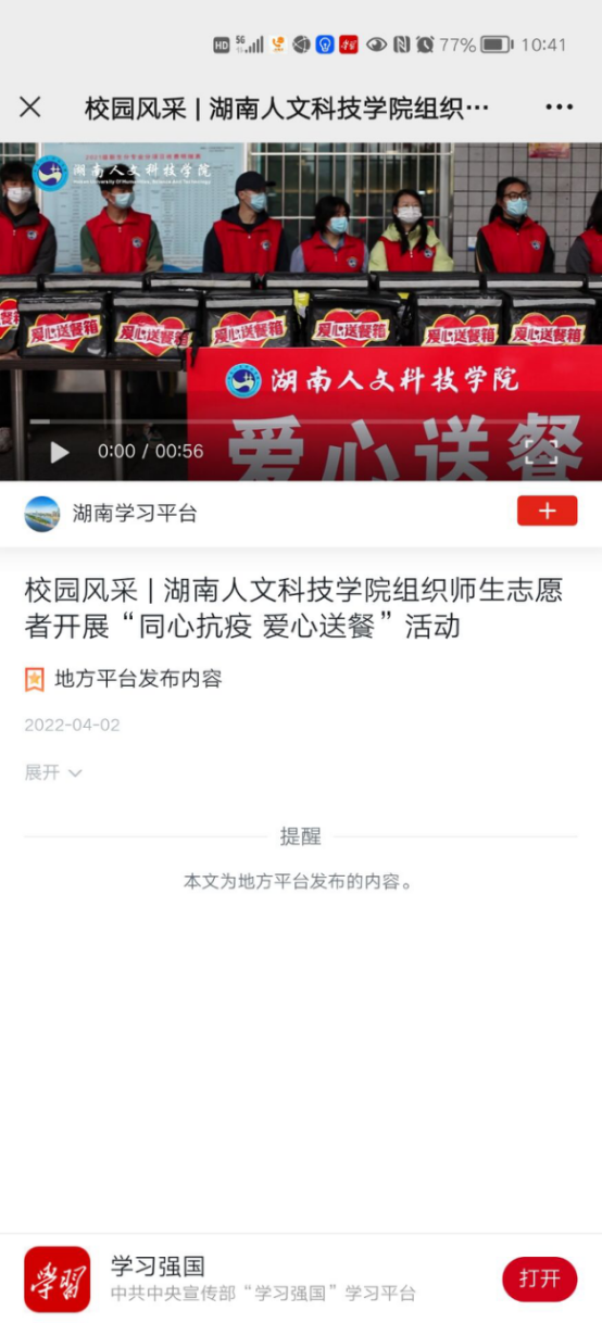 党委副书记李军林指示宣传部门,疫情防控是当前最大的政治,也是最佳的新闻热点,选树典型弘扬正能量正当时。他亲自统筹调度,宣传部积极组织,第一时间促成了“暖心”送餐志愿服务的新闻在各大媒体报道,宣传部拍摄的暖心送餐视频上了学习强国湖南平台,新湖南、红网、湖南教育新闻网等媒体也跟进报道。(宣传部)