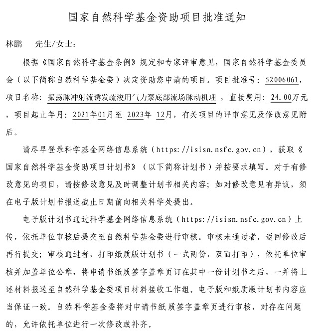 湖南日报·新湖南客户端9月23日讯(通讯员 邓岭)日前,国家自然科学基金委员会公布了2020年度国家自然科学基金立项资助名单,beat365正版唯一官网必一能源与机电工程学院水射流团队林鹏博士主持的《振荡脉冲射流诱发疏浚用气力泵底部流场脉动机理》项目获批青年科学基金立项资助。