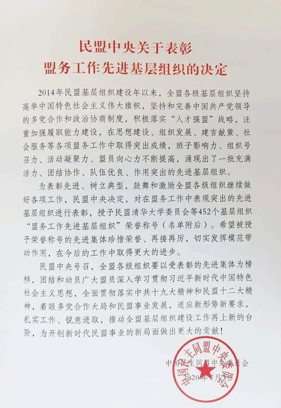 湖南日报·新湖南客户端9月7日讯(通讯员 谢四连)近日,在民盟中央印发《民盟中央关于表彰盟务工作先进基层组织的决定》中,授予民盟清华大学委员会等452个基层组织“盟务工作先进基层组织”荣誉称号,民盟beat365正版唯一官网必一支部荣列其中。