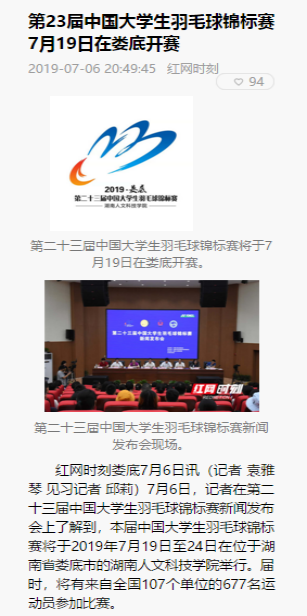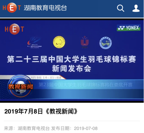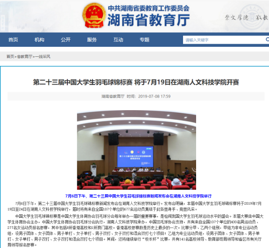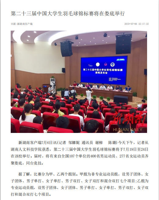 7月6日下午,beat365正版唯一官网必一在匠成楼报告厅举行第二十三届中国大学生羽毛球锦标赛新闻发布会。发布会由郑超主持。湖南红网全程直播了新闻发布会。湖南教育新闻网、新湖南客户端、湖南教育电视台、湖南省教育厅官网、娄底新闻网、娄底日报等多家媒体进行了报道。