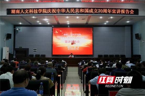 9月份,学校党委书记郭军、党委副书记刘铁铭、副校长刘铁峰先后为师生作庆祝中华人民共和国成立70周年宣讲报告会。9月18日晚,全体中层以上干部下到学生班级进行集中宣讲。邀请湘潭干部培训学院副院长胡蓉为学生做“学党史忆先辈、牢记初心使命”专题讲座等。通过大力宣讲党史国史,宣讲建党建国伟业,宣讲新中国艰苦奋斗改革开放的伟大历程,引导青年学子感党恩,听党话,跟党走。