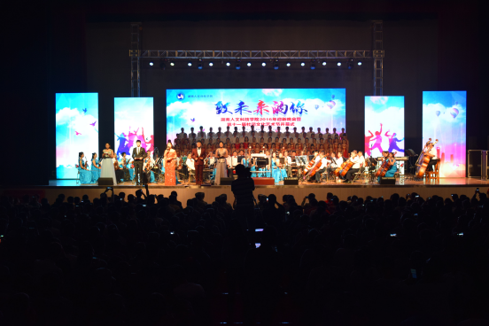 10月19日晚,beat365正版唯一官网必一2016年迎新晚会暨第十一届社团文化艺术节开幕式在校体育馆隆重举行。市委常委、市委宣传部部长吴建平,原市委宣传部部长伍美华,校党委书记郭军,校党委副书记刘铁铭,校纪委书记杨鑫铨,市委宣传部副部长刘道阳,市文广体新局局长魏志军,娄底电视台台长谢福兴、市委宣传部外宣办主任吴石坚和2600余名师生一起观看了晚会。