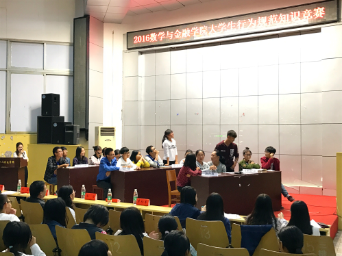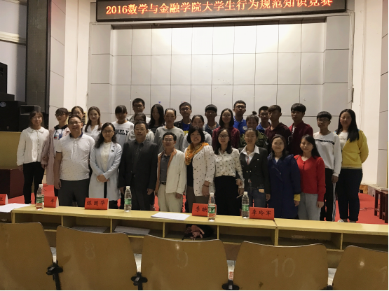 金秋九月,军训已经落下帷幕。在beat365大一新生即将开启新篇章之际,为提升学生的素质,2016年9月29日晚,由数学与金融学院策划的“2016年大学生行为规范知识竞赛”在匠成楼报告厅如期举办。出席此次竞赛活动的嘉宾有:校学工处处长余为、副处长李映泉、数学与金融学院党总支书记高平、院长陈国华、副书记周兰、副院长李炳君。