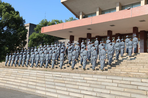 “齐步走!一二一、一二一!立正!”尽管赤日当空,但新生们热情不减,精神抖擞地参与到训练当中,一遍又一遍地练习新学的动作,站军姿、齐步走、敬礼、摆臂……在教官的一一指正下,开始渐入佳境,将这些动作刻入骨子里,汗水一滴一滴地打在地上,是他们每个人的艰辛与坚持的见证。与此同时,由各排精英组成的方阵队也开启了他们的正式训练。台阶军姿是他们的第一课,这是为了训练队员将重心前移后,增强身体的稳定性,同时也锻炼队员的腿部力量,让他们体会由腿部到全身的发力特点,为以后的训练打下良好的基础。“兄弟!加油!”,顶着炎炎烈日,正在站台阶军姿的他们互相鼓励、呐喊助威,为同伴打气的同时,也是在为自己鼓劲,他们脸上的汗水也在阳光的照耀下折射出耀眼的光芒。
