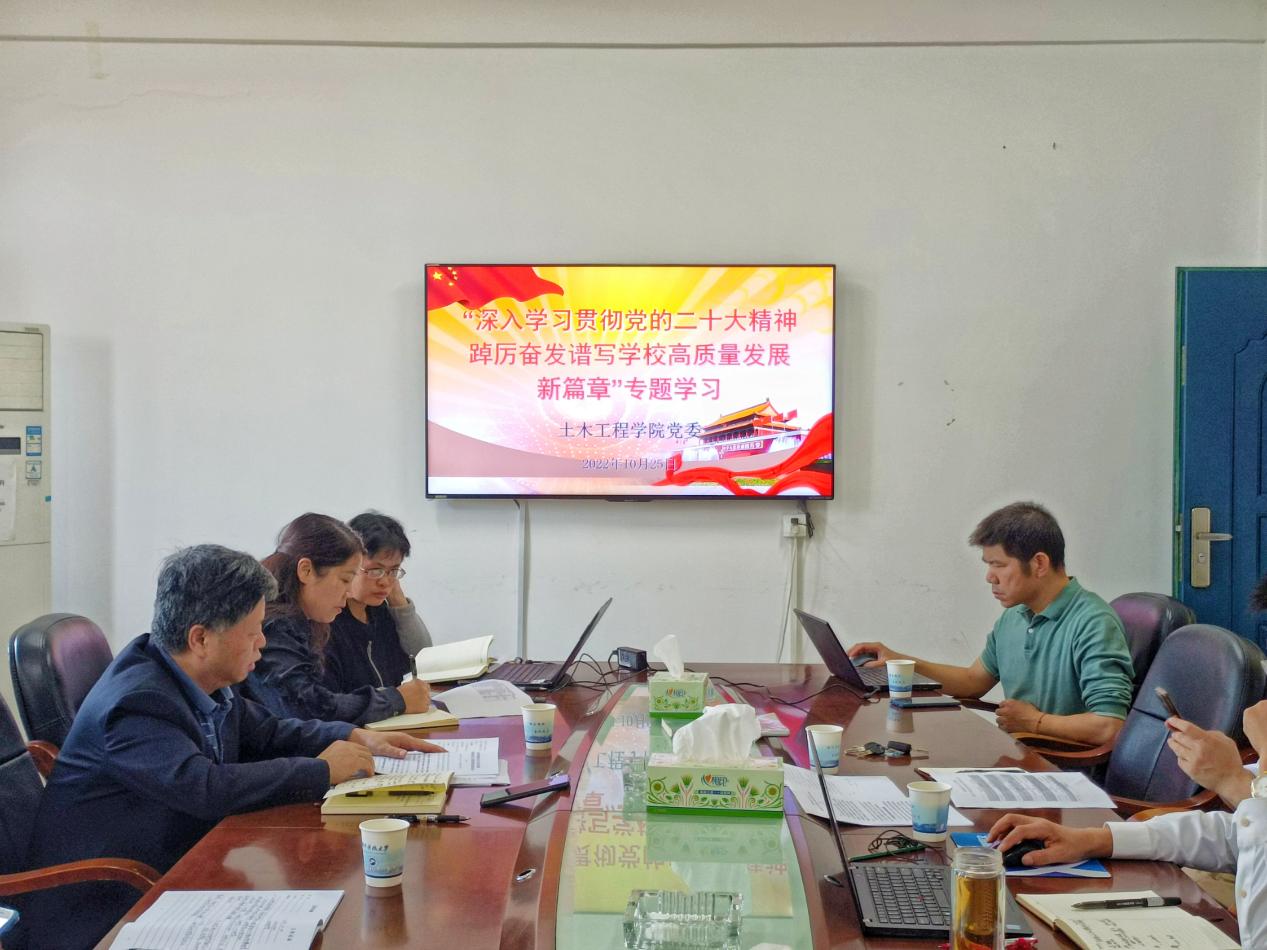 为进一步学习党的二十大精神,全面贯彻习近平新时代中国特色社会主义思想,推动学校工作高质量发展。2022年10月25日上午9:00,776net必赢官网党委于土木楼213A会议室开展了“深入学习贯彻党的二十大精神,踔厉奋发谱写学校高质量发展新篇章”专题学习。776net必赢官网党委书记祝明桥,院长孙洪鑫,院党委副书记王艳及院党委委员、院党政办主任、组织专员参与此会。