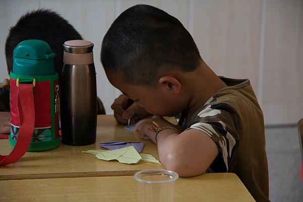 课堂上,志愿者们首先向孩子们介绍了即将制作的折纸作品——带有翅膀的爱心,然后为孩子们讲解折纸的步骤,细致解说,反复演示。孩子们被分为四组,每一组有两位志愿者从旁指导。孩子们边听边学,努力地完成自己的作品,遇到不会的步骤时向志愿者们请教,在志愿者的协助下共同完成折纸作品。在此之后,志愿者们给每位孩子分发了一支笔,并与孩子们一起在作品上写下他们想要感恩的人。“老师,袁隆平爷爷怎么写?”“老师,你的名字怎么写?”孩子们纷纷举手提问,志愿者们俯身握住孩子的手,一笔一划地教孩子们写下他们心中所想的名字。