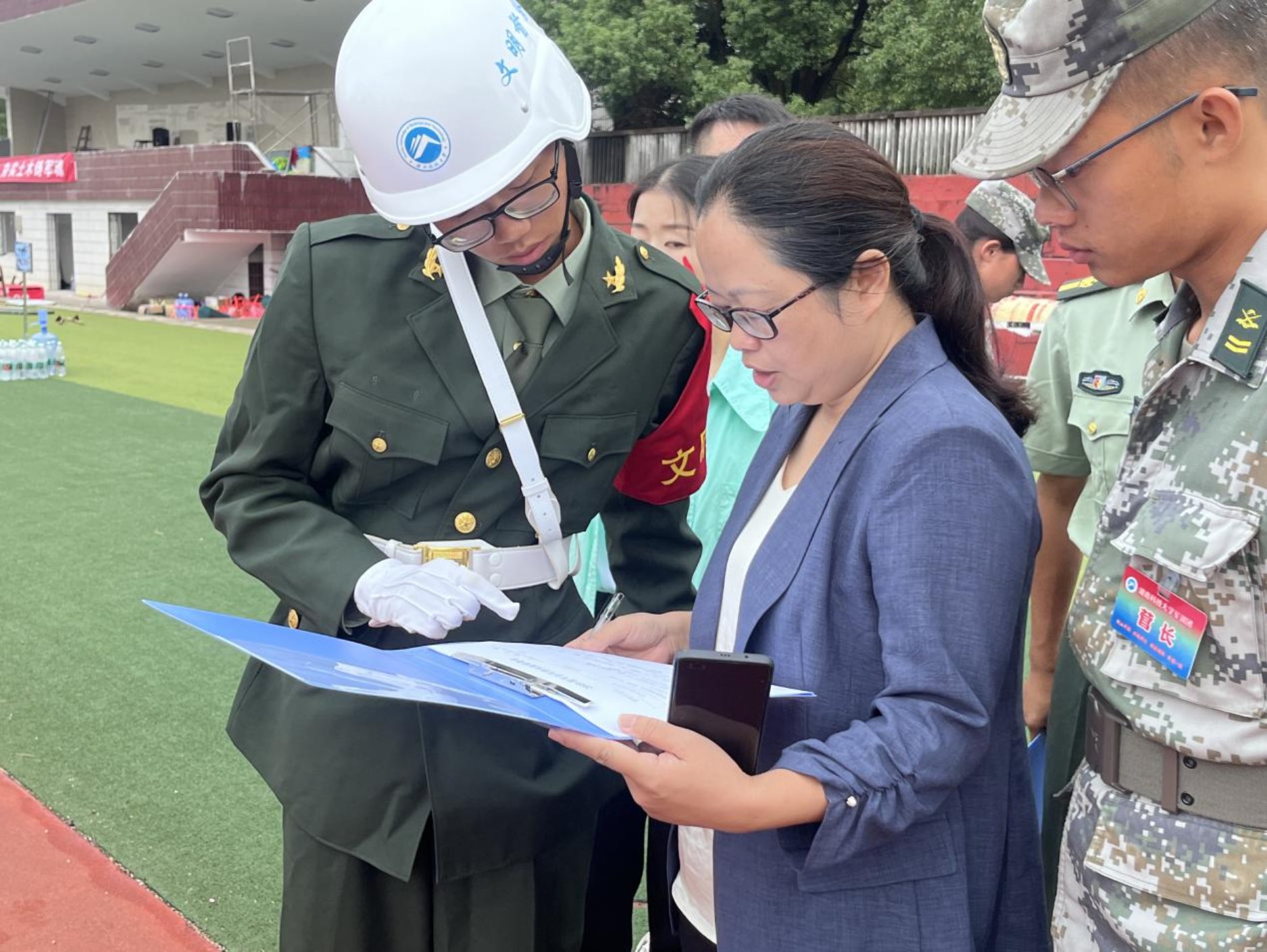 2023年9月21日,776net必赢官网23级新生在第二田径场认真开展军训。院党委副书记陈笑、学工办主任周姣术和校督察队队员到达军训场地,与教官们一起对新生的军容风纪进行了全面检查。