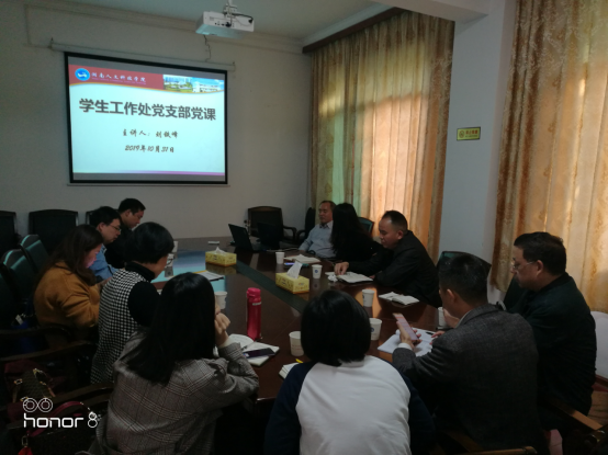 10月31日,学校党委委员、副校长刘铁峰在明德楼218会议室以《不忘初心、牢记使命,充分发挥党员先进模范作用》为题,为学生工作处、校团委联合党支部全体党员上主题教育党课。