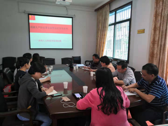10月11日上午,学生工作处党支部书记刘红燃在明德楼218为支部同志上题为“理想与信念之光——湘籍无产阶级革命家群体的党性修养”的“不忘初心、牢记使命”主题教育专题党课。团委、学生工作处全体党员参加了此次学习。