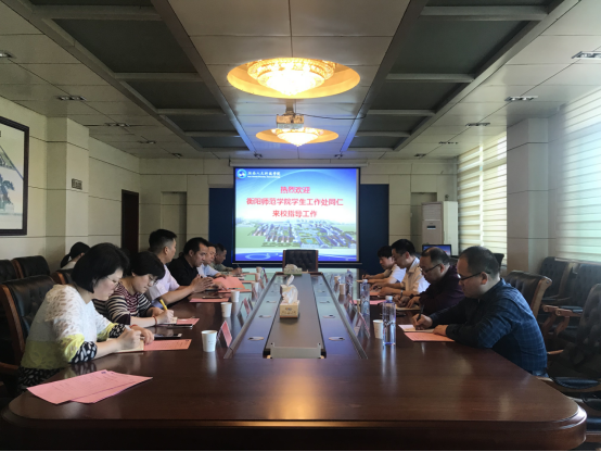 4月25日下午,衡阳师范学院学生工作部、武装部部长蒋杰、副部长文怀诚、学生管理科科长周利兵、易班发展中心负责人王鲁南一行四人来beat365交流指导。beat365武装部部长、保卫处处长郑秀星,团委书记魏彦煜、学生工作部(处)副部(处)长李玲军等领导进行接待。