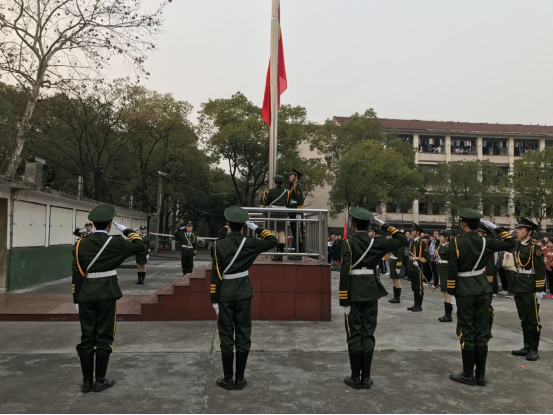 6:50分,在全体师生的注目礼下,英姿飒爽的国旗护卫队队员们护送鲜艳的五星红旗进场,伴随着庄严的国歌,五星红旗冉冉升起,迎风飘扬。在场的每一个人向国旗敬礼,深怀对祖国无限的热爱和崇高的敬意。
