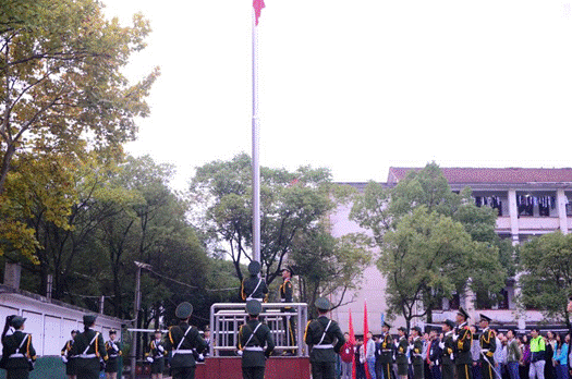 6点50分,国旗班的旗手们着装整齐,迈着矫健的步伐,护着鲜艳的五星红旗入场。伴着《义勇军进行曲》国歌声的响起,五星红旗冉冉升起。
