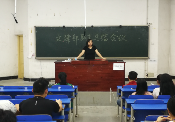 为总结本学期文建工作,努力将文建工作越做越好,6月27日晚上8点,文建部在致远楼120教室组织召开了文建部期末总结会议,校文建部学生全体干部以及各院部负责人参加了此次会议。学工处刘红燃副处长,曹宇科长,梁琼老师和丁友坤老师四位老师出席本次会议,会议由办公室干事程文进,丘卓辉主持。