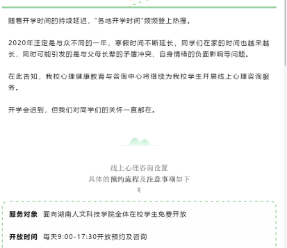 疫情期间,老师们全天在线通过微信、电子邮件、QQ在线等提供多渠道咨询方式,及时疏解学生的不良情绪。中心网络咨询每天开放,截至4月13日,共累计咨询52人次。并依托微信公众号推送推文,引导学生在疫情期间自我求助与积极求询。