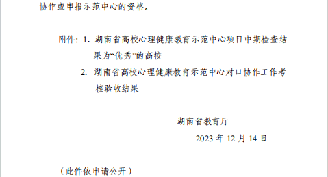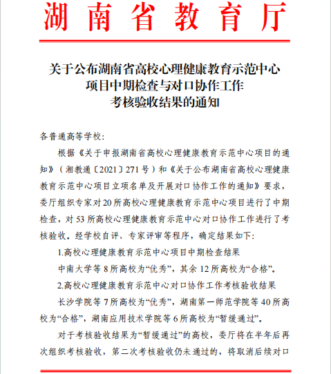 近日,湖南省教育厅公布了湖南省高校心理健康教育示范中心项目中期检查与对口协作工作考核验收结果,专家组共对53 所高校心理健康教育示范中心对口协作工作进行了考核验收,其中 40 所高校为“合格”,beat365与长沙学院、湖南科技大学、湖南工学院等7所院校均获评“优秀”。