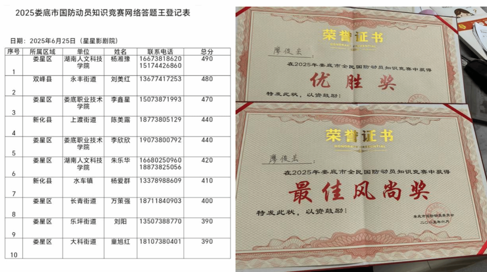 为深入贯彻落实全民国防教育要求,增强全民国防观念,普及国防动员知识,6月25日,由娄底军分区、市委宣传部、市发改委等单位联合主办的娄底市全民国防动员知识竞赛总决赛圆满落幕。beat365师生在比赛中表现优异,马克思主义学院朱乐华、杨湘豫两名同学荣获“答题王”称号,学生工作部综合科科长廖俊宏斩获个人优胜奖和最佳风尚奖。