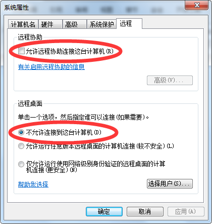 二、及时关闭计算机上的远程桌面功能,如需远程协助尽量使用QQ的“远程协助”功能或者“teamviewer”等远程协助工具。关闭计算机远程桌面方式,如下图(以Windows7系统为例)