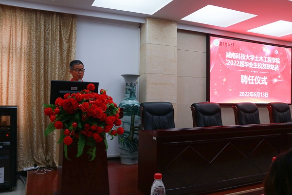 会议由肖鹏飞主持。首先,刘星宣读《关于2022届毕业生校友联络员的聘任决定》。他指出校友联系员是经过自愿报名、学院推荐、学校审批而选拔出来的优秀代表,学院殷切盼望联络员们认真履行职责,充分发挥桥梁纽带作用,为学院和学校的校友工作,为促进母校和校友的发展做出自己的贡献。接着,曾淑艳宣读《校友联络员工作职责》,她向校友联络员详细说明他们的职责:接受学院的指导,主动和本班同学联络,整理和收集校友信息,及时向学院汇报校友动态。积极组织班级同学参加学校校庆日、校友访校日等活动,接受传达母校的信息。广纳校友对学校和学院建设发展的意见并反馈给学院。曾淑艳强调联络员的工作贵在坚持,要让毕业校友感受到母校永远是温暖的港湾。然后,校友联络员代表高佳发言。他先感谢学院和老师的栽培,承诺为构建起学院和校友之间的桥梁兢兢业业,不负母校重托。