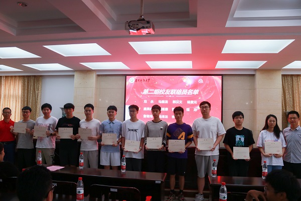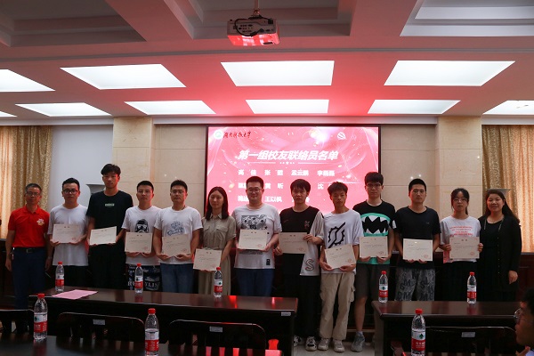 院校友留念办主任肖鹏飞和院学工办主任刘星给联络员颁发证书并合影