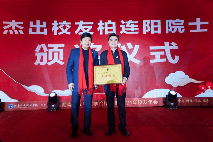 刘和云为大力支持母校发展的杰出校友代表柏连阳院士和傅胜龙董事长颁奖。