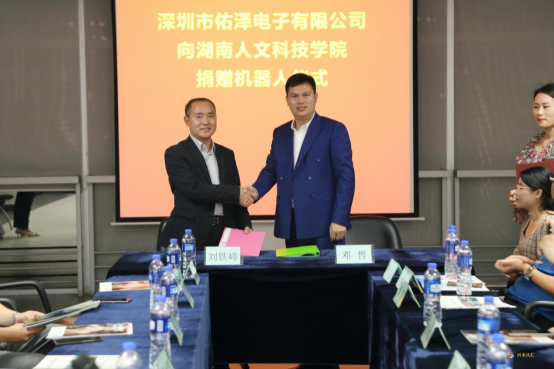 3月15日下午,深圳市佑泽电子有限公司总经理、体育01级5班邓哲校友向母校捐赠工业机器人仪式在深圳市南山区留学生创业大厦举行,副校长刘铁峰出席并代表学校在捐赠协议书上签字,校友办主任刘光辉、能机学院陈新博士、深圳祁阳商会会长丁衡,beat365深圳校友会名誉会长曹余辉、副会长彭尚武、副会长兼秘书长王平聚等20多名校友代表一同参加了捐赠仪式和随后举行的座谈会。