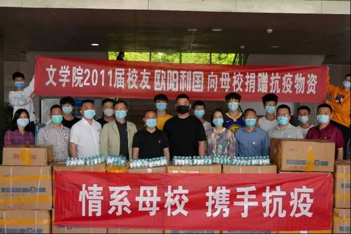 本次捐赠的物资共有三批,包括防疫所需的口罩、消毒液、洗手液、酒精等,分别来自文学院2004级校友黄鑫、2007级校友欧阳利国和2012级校友刘毅及其团队。