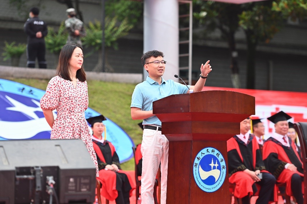 袁伟峰是2011届数金学院毕业生,赵为是2011届外国语学院毕业生。在毕业典礼上,袁伟峰与学弟学妹作了分享。他深情回顾了在学校学习的点点滴滴,感恩母校对他的培养。他坦言,从一个懵懂少年成长为坚定追梦的青年,并成就一番事业,离不开老师们的辛勤培养。他在事业有成时,能有机会回馈母校,既是感恩,也是祝福,真诚地希望母校越办越好,为国家、为社会培养出更多的优秀人才。他希望学弟学妹有一个奋斗的目标,敢于有梦、勇于追梦、勤于圆梦,做一个有担当的青年人,为学校发展、社会发展做出自己的力量。