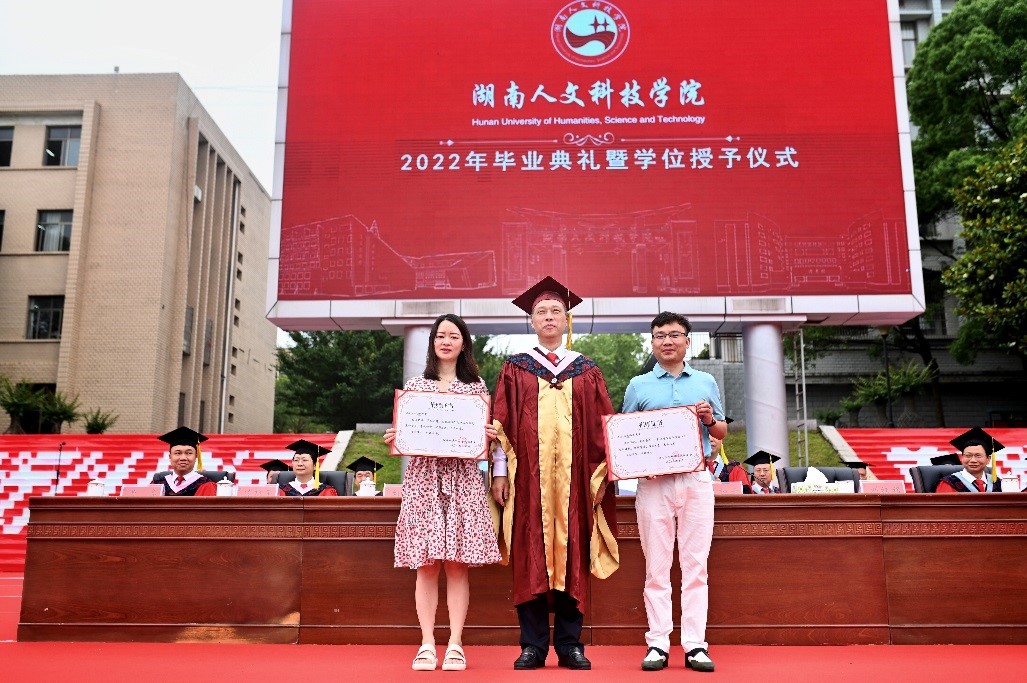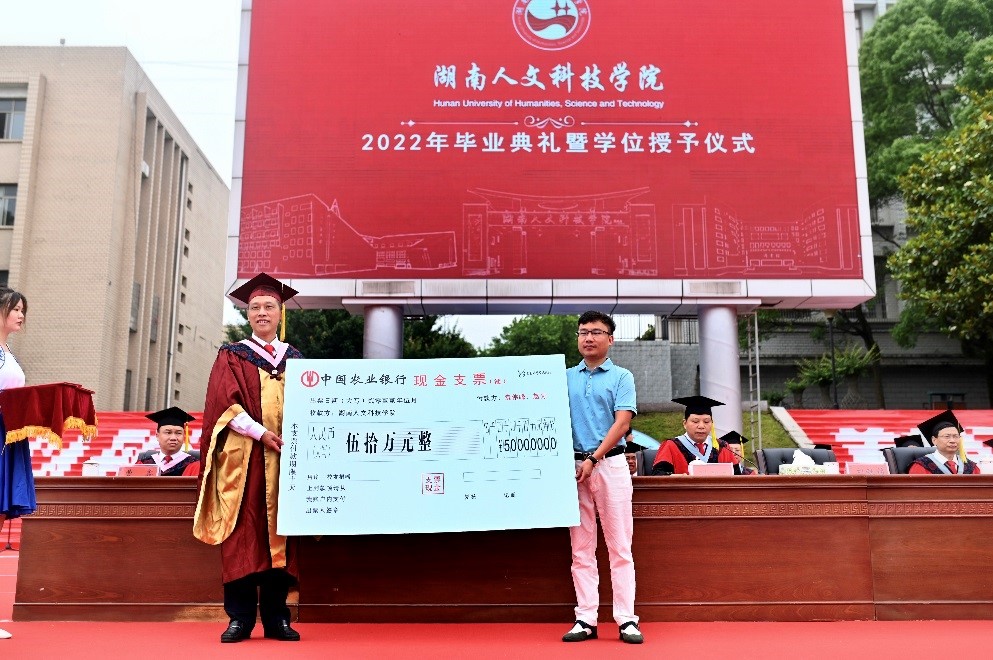 在2022届毕业生离校之际,beat365校友、湖南中鑫资询信息科技有限公司董事长袁伟峰、夫人赵为受邀回校参加毕业典礼暨学位授予仪式。