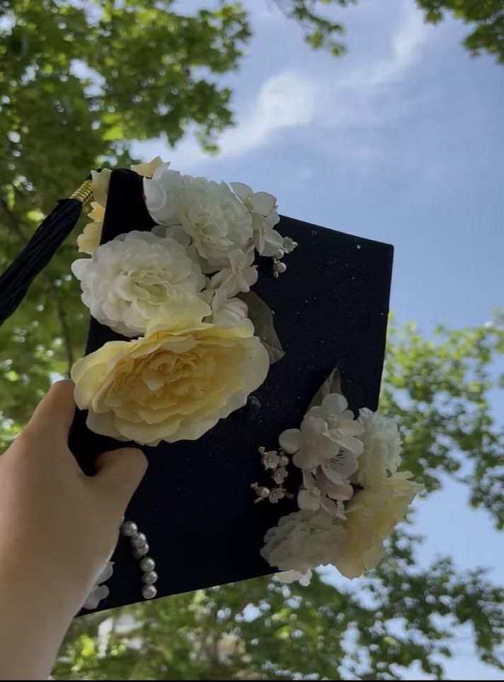 斑驳的树影在肩头跳动,像是给这场特别的仪式撒下细碎的星光,我轻轻举起亲手制作的毕业帽,指尖摩挲着边缘歪歪扭扭的缝线,那是熬夜剪裁时留下的印记,也是大学时光的见证。帽檐上缀点的小装饰,藏着我对校园的眷恋,每一处细节都饱含着对青春的不舍与对未来的期许。