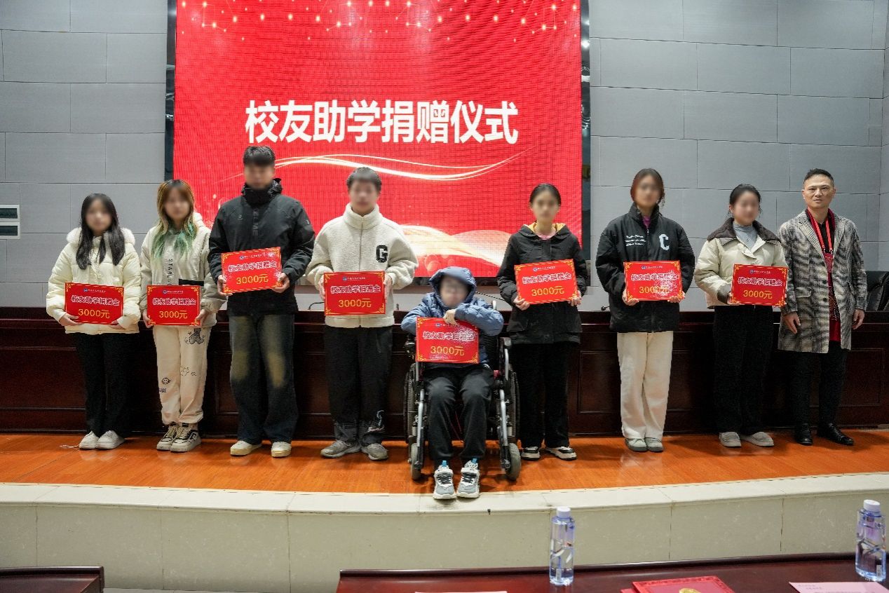 学校教育基金会秘书长陈瑶主持校友助学捐赠仪式,东莞市青之伙服饰有限公司董事长、校友李娟,杭州旨成网络科技有限公司董事长、校友楼建军为受捐赠学生发放助学金。