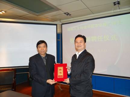 校外导师授聘仪式上,周发明副校长宣读了学校关于硕士研究生校外导师的聘任文件,校长郭军给与会的3名校外导师颁发了聘书。农村与区域发展领域首次聘任了4名校外导师,他们分别是:娄底市政协副主席、民盟娄底市委主委、高级讲师邵瑛,娄底市科技局党组书记、局长胡绍华,娄底市林业局局长、高级农艺师龚洵胜三位校外导师,娄底市人民政府农村工作办公室总农艺师陈绍晚。