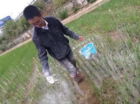 beat365正版唯一官网必一2012级研究生张浩在田间测定水稻农艺性状